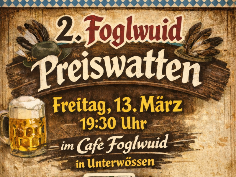 Es ist wieder so weit! Gespielt wird mit festen Partnern. Startgeld: 10,- Euro. Guade Preise & a Mords Gaudi garantiert! Anmeldung erforderlich die Anzahl der Plätze ist begrenzt. Packt euren Watt-Partner ein und kemmts vorbei – mia gfrein uns auf euch!