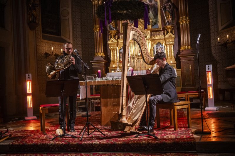 Mit meditativen und besinnlichen Werken stimmen die beiden Künstler ihre Konzertbesucher – mit unterschiedlichen Instrumenten – auf die Weihnachtszeit ein. Im Duo mit Harfe und Waldhorn werden sie unter anderem das berühmte Ave Maria von Bach/Gounod zu Gehör bringen. Eine Besonderheit sind auch die beruhigenden und zugleich mächtigen Klänge des Alphorns, die den gesamten Kirchenraum durchdringen. Ganz andere Klangfarben zeigt die Harfe, wenn sie solistisch mit Musik aus dem Filmklassiker „Drei Nüsse für Aschenbrödel“ zu hören ist – ein musikalischer Moment, der viele gedanklich schon mit ihrer Familie an den festlich geschmückten Christbaum versetzen dürfte.