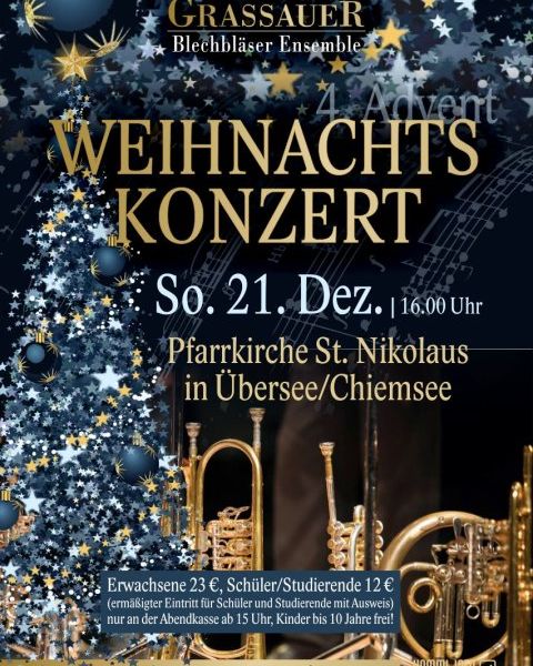 Festliches Weihnachtskonzert in St. Nikolaus Das Grassauer Blechbläser Ensemble lädt zum 4. Advent Karten gibt es nur an der Tageskasse. Die öffnet um 15 Uhr. Sie kosten 23 Euro, für Schüler oder Studierende mit entsprechendem Ausweis 12 Euro. Kinder bis 10 Jahre erhalten freien Eintritt.