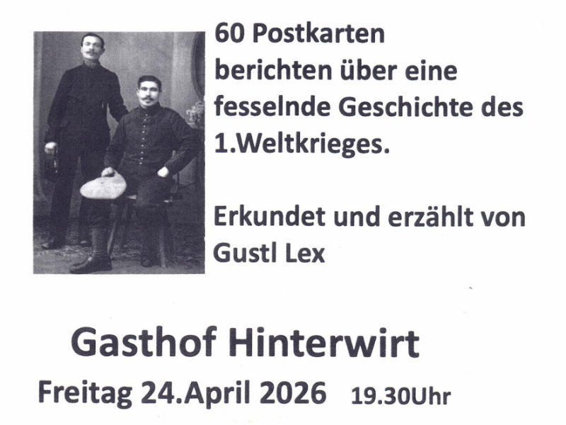 60 Postkarten berichten über eine fesselnde Geschichte des 1. Weltkrieges. Erkundet und erzählt von Gustl Lex