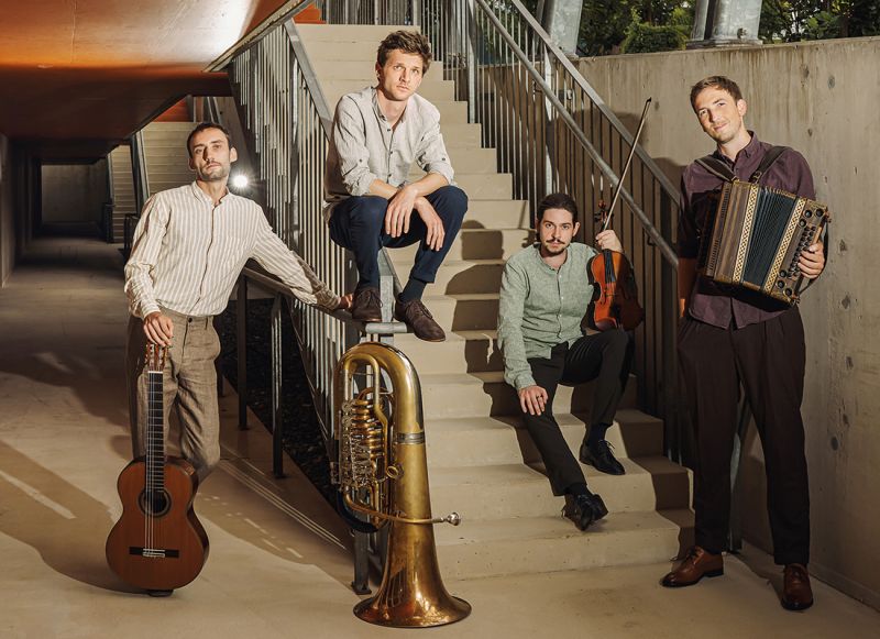 Das Leichte ist am schwersten – Geige, Steirische Harmonika, Gitarre und Tuba – vier virtuose Musiker weben ein dynamisches, kammermusikalisches Geflecht, das in einer Eleganz und Leichtigkeit aufblüht, die man im Zusammenhang mit Volksmusik so nicht erwartet hätte.