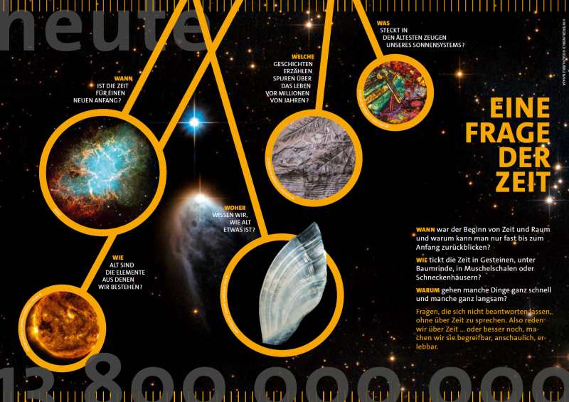 So lernen Sie, dass ein Blick in die Sterne gleichzeitig ein Blick in die ferne Vergangenheit ist. Sie erfahren, wie sich die Zeit in Dingen wie Gesteinen, Bäumen oder Muschelschalen versteckt und wie man ihr auf die Spur kommt. Sie bekommen eindrucksvoll dargestellt, wie viel Zeit nicht nur in der Entwicklung unserer Erde, sondern auch in der unseres Universums steckt. Machen Sie sich auf zu einer Zeitreise.