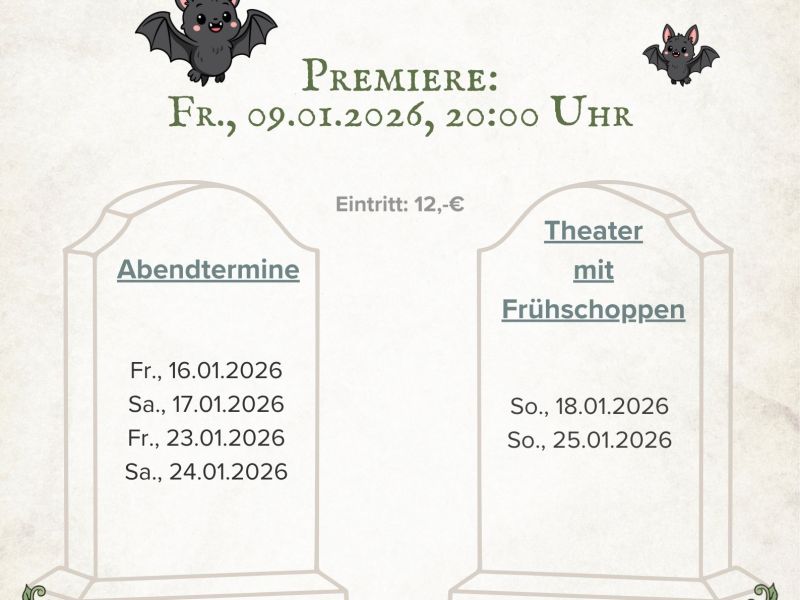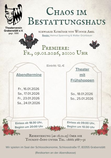 Der Theaterverein Grabenstätt spielt im Januar 2026 die Komödie „Chaos im Bestattungshaus“ von Winnie Abel. Das Stück handelt von einem Bestattungshaus, welches in finanziellen Problemen steckt, weshalb sich der Bestatter auf ein unmoralisches Angebot einlässt. So ist er bereit, für einen Fabrikanten eine Beerdigung zu inszenieren – doch dieser ist eigentlich gar nicht tot. Der Lebemann möchte auf schräge Weise von seiner verbitterten und reichen Frau loskommen und dabei eine ganze Menge Geld mitnehmen. Im Laufe des Stücks treffen die Ehefrau und die Geliebte des Fabrikanten aufeinander und der Gerichtsvollzieher, der die Schulden im Bestattungshaus eintreiben soll, wird kurzerhand von der Bestatter Gattin abgefüllt. Eine rasante, schwarze Komödie mit urkomischen Charakteren und viel Witz! Die Premiere steigt am Freitag, den 09.01.2026 um 20:00 Uhr, Einlass ab 18:30 Uhr. Weitere Abendtermine sind am 16.01. und 17.01.2026 sowie am 23.01. und 24.01.2026 - Beginn jeweils um 20:00 Uhr, Einlass ab 18:30 Uhr. Besondere Termine: Am 18. Januar 2026 sowie am 25. Januar 2026 beginnt die Vorstellung jeweils bereits um 10:30 Uhr, ab 9:00 Uhr wird ein Weißwurstfrühstück angeboten! Reservierungen sind ab 08.12.2025 werktags über die Tourist-Information unter der Telefonnummer 08661 9887-31 oder 08661 9887-32 möglich. Restkarten an der Abendkasse. Der Eintritt beträgt 12,00 €. Regie: Helmut Spannring & Walter Grünbauer