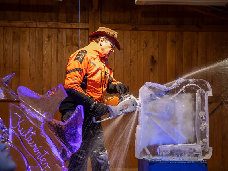 Genießen Sie eine spektakuläre Eisschnitz-Show des international bekannten Eiskünstlers Christian Staber. Seit 1997 schnitzt er riesige Eisfiguren frei Hand oder kreiert Eisskulpturen aus Klareis in allen Größen und Formen. Mit seiner „Eiskalten Kunst“ hat sich Christian Staber über den europäischen Raum hinaus einen Namen gemacht und bei unzähligen Wettbewerben Preise gewonnen.