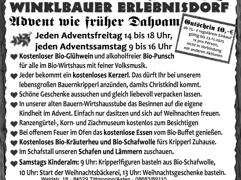 Beim Winklbauer Erlebnisdorf erwartet Euch ein Adventserlebnis wie es früher einmal war. Es gibt feine volksmusik. Jeder Besucher bekommt ein kostenloses Kerzerl, das er bei der lebensgroßen Bauernkrippe anzünden darf. In der Bauern-Wirtsstube fällt das Besinnen auf die eigene Kindheit im Advent leicht. Das Ranzengürtel-, Korn- und Ziachmuseum ist zu Besichtigen. Bei offenem Feuer das kostenlose Essen vom Bio Buffet geniessen. Im Schafstall kann zu den Schafen und Lämmern geschaut werden.