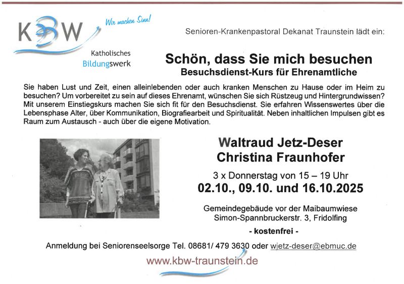 Sie haben Lust und Zeit, einen alleinstehenden oder auch kranken Menschen zu Hause oder im Heim zu beuschen? Mit unserem Einstiegskurs machen Sie sich fit für den Besuchsdienst.