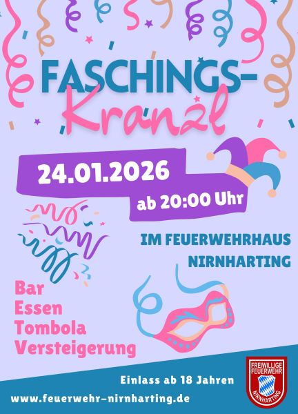 Die Freiwillige Feuerwehr Nirnharting lädt zum Faschingskranzl in der Fahrzeughalle ein. Bei diesem Faschingshighlight gibt es eine Versteigerung und eine Tombola mit tollen Preisen. Für Essen, Getränke und Musik ist bestens gesorgt. Als Höhepunkt des Abends stattet dieser Veranstaltung meist die weithin bekannte Waginger Faschingsmusi einen Besuch ab.