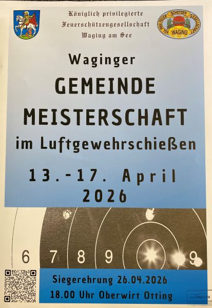 Vom 13. April bis 17. April 2026 lädt die Kgl. priv. Feuerschützengesellschaft Waging am See herzlich zur 45. Gemeindemeisterschaft im Luftgewehrschießen im Schützenheim an der Weixlerstraße ein.