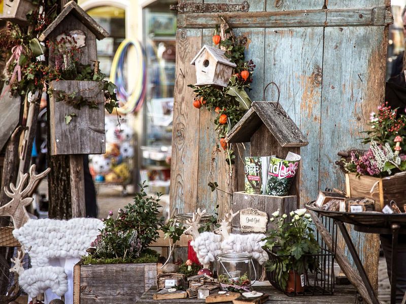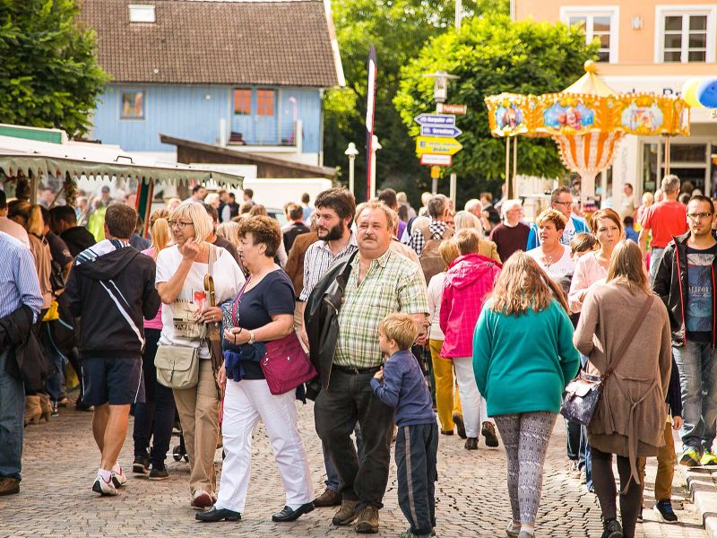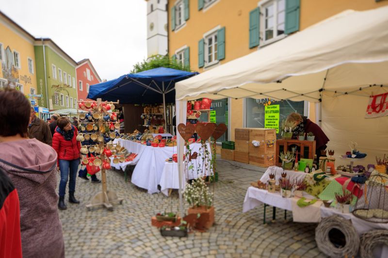 Markt mit zahlreichen Fierantenständen im Ortskern von Waging am See.