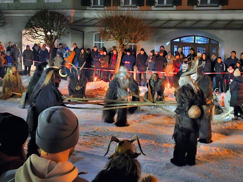 Ab 18 Uhr Perchtenglühwein und alkoholfreier Perchtenpunsch, Bosna und Würstl vom Grill. Wildes Treiben der Perchten ab 19 Uhr.