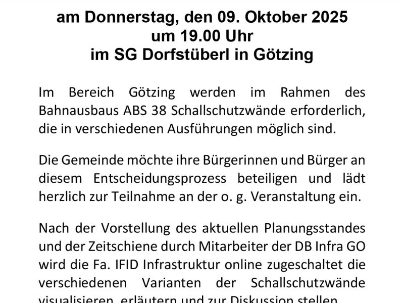 Im Bereich Götzing werden im Rahmen des Bahnausbaus ABS 38 Schallschutzwände erforderlich, die in verschiedenen Ausführungen möglich sind. Nach der Vorstellung des aktuellen Planungsstandes und der Zeitschiene durch Mitarbeiter der DB Infra GO wird die Fa. IFID Infrastruktur online zugeschaltet die verschiedenen Varianten der Schallschutzwände visualisieren, erläutern und zur Diskussion stellen